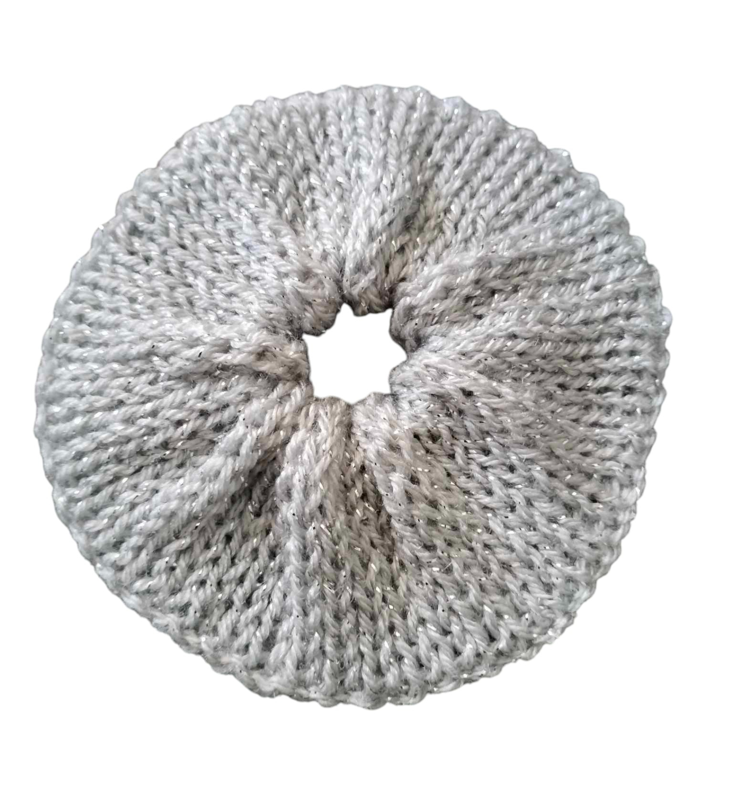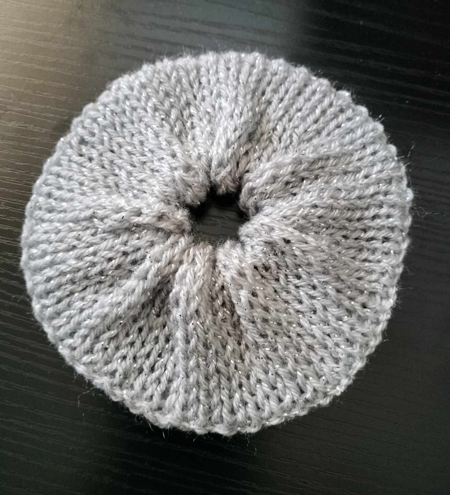 Elastic de par tricotat, cu diametru de 12 cm Materialul este fir de tricotat sal sim / mohair argintiu: 25% lana 75 % acrilic
