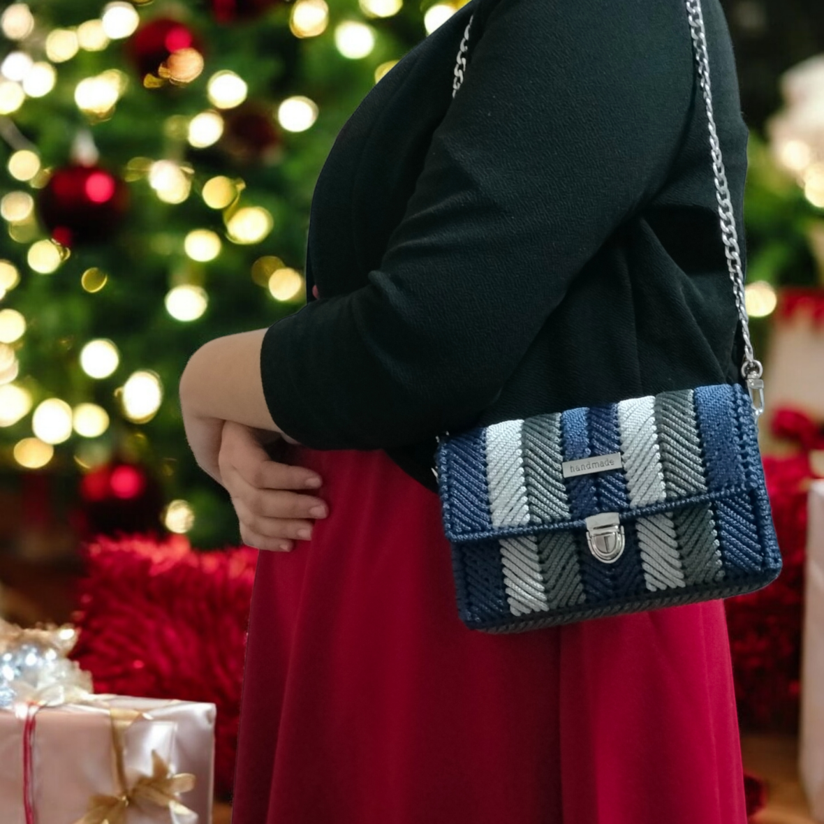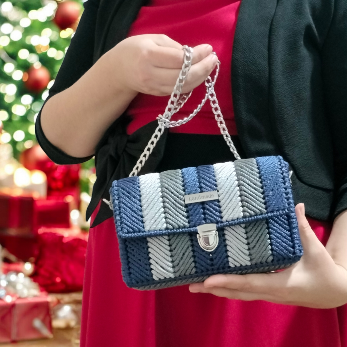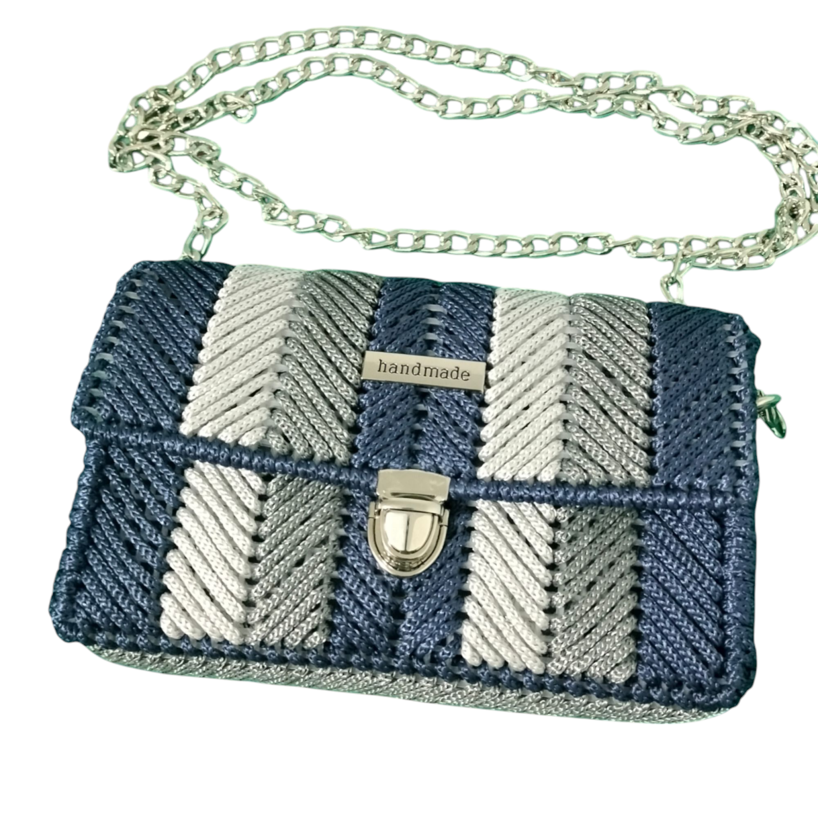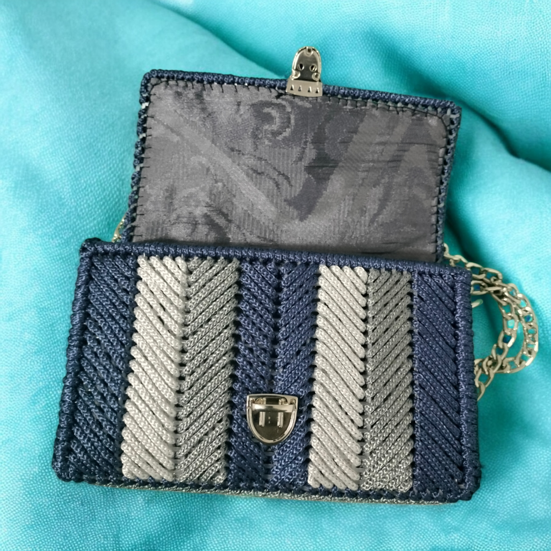 Geanta este lucrata manual 100%, din fir tip macrame, 100% poliester, pe baza de plastic Canvas.