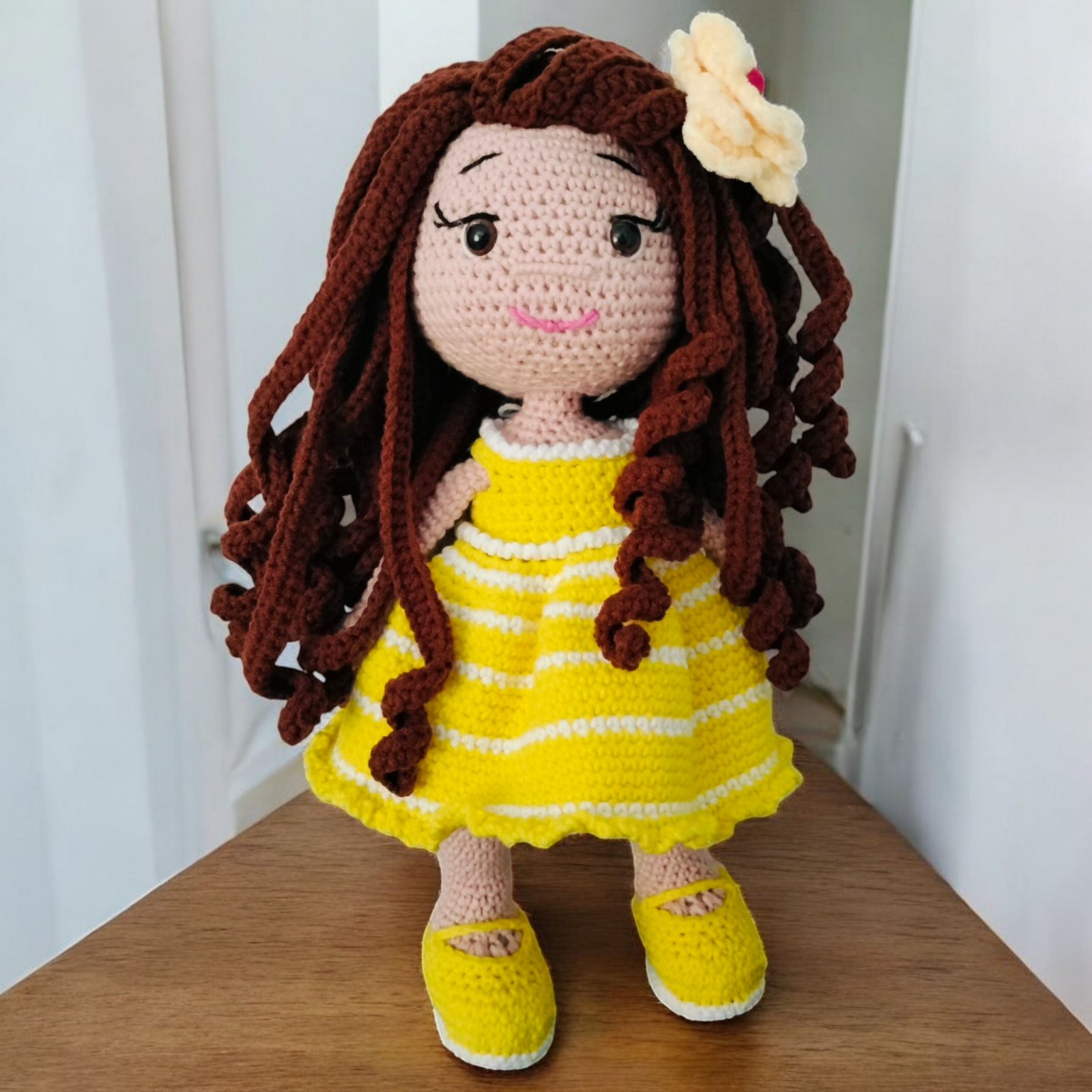 Imbracata intr-o rochita galbena vesela, papusa are detalii lucrate cu atentie: bucle lungi, pantofiori crosetati si o floare delicata in par. Este usoara, moale si potrivita pentru toate varstele.